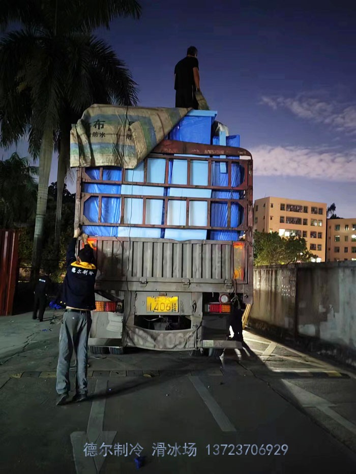 冰場(chǎng)設(shè)備及材料裝車(chē)發(fā)運(yùn)照片。圖為設(shè)備與材料從深圳德?tīng)栔评涔狙b車(chē),即將發(fā)運(yùn)到南京溧水區(qū)無(wú)想水鎮(zhèn)富城薈廣場(chǎng)。