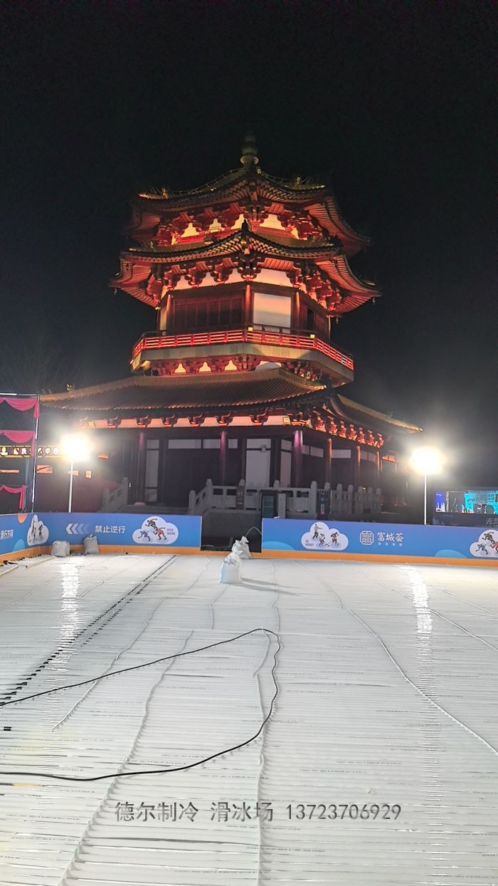 南京市溧水區(qū)無(wú)想水鎮(zhèn)富城薈室外滑冰場(chǎng),建設(shè)于2024年春節(jié)前的數(shù)九寒冷天氣,在春節(jié)到來(lái)前夕,及時(shí)開(kāi)業(yè),為周邊市民提供了春節(jié)期間娛樂(lè)好項(xiàng)目。該溜冰場(chǎng)為室外人工真冰溜冰場(chǎng),由深圳市德?tīng)栔评湓O(shè)備有限公司施工建造。此溜冰場(chǎng)為溧水區(qū)第一個(gè)室外真冰溜冰場(chǎng),它位于無(wú)想水鎮(zhèn)富城薈廣場(chǎng)核心區(qū),古代建筑風(fēng)貌的街景與現(xiàn)代城市的消費(fèi)形態(tài)相得益彰。夜晚燈光璀璨時(shí),映在冰面的燈光霓虹閃爍,與周邊街景構(gòu)成一幅色彩斑斕的夜色美景。