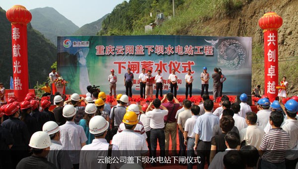 2012年8月10日,重慶云能投資興建的重慶市云陽縣蓋下壩水電站工程成功下閘蓄水。10時(shí)18分,隨著云陽縣委書記李洪義的一聲令下,巨型閘門穩(wěn)穩(wěn)落在導(dǎo)流洞進(jìn)口閘槽底部后,下閘蓄水宣告圓滿成功。